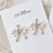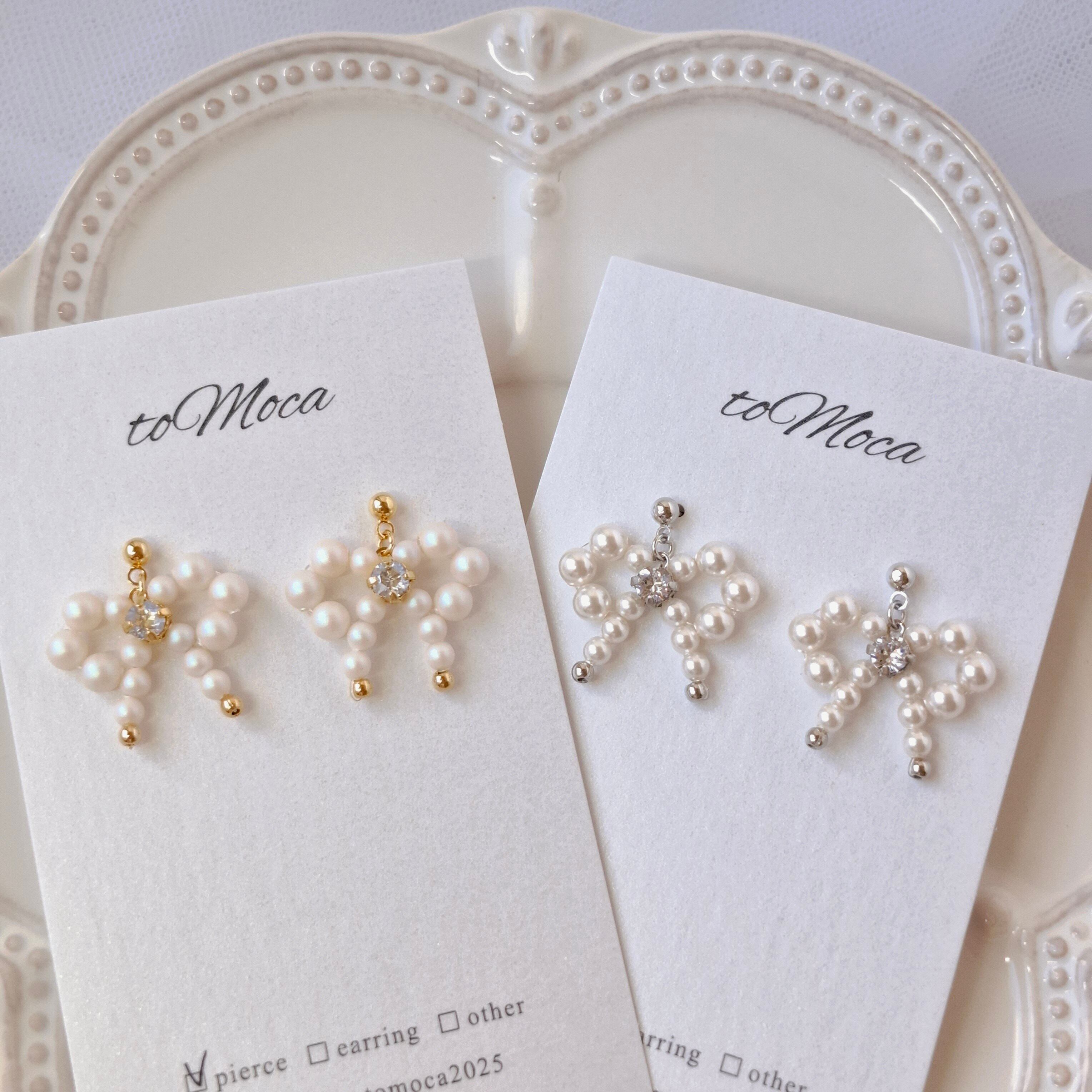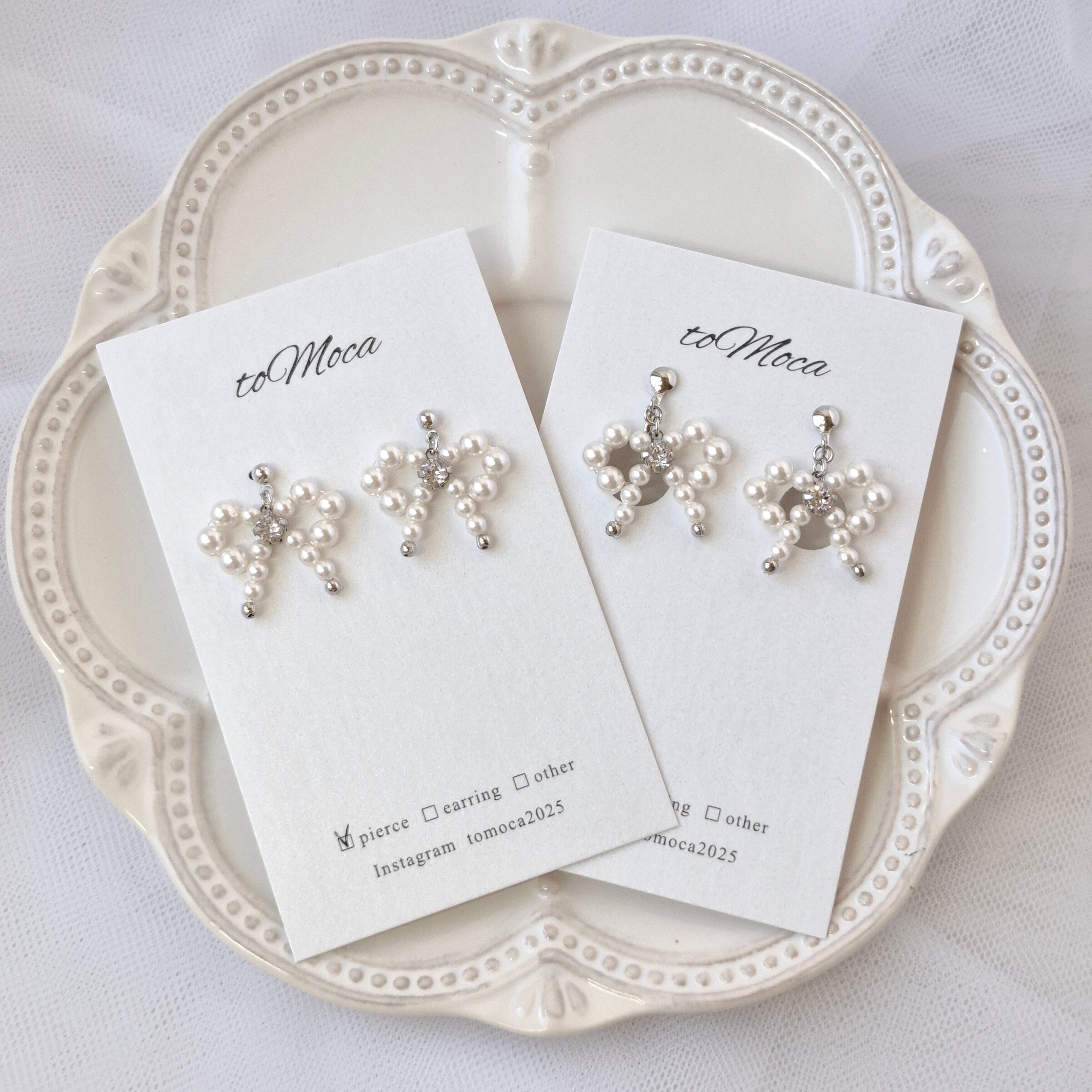 【Petit Pearl Ribbon】 パールの揺れるリボンピアスorイヤリング【ホワイト】