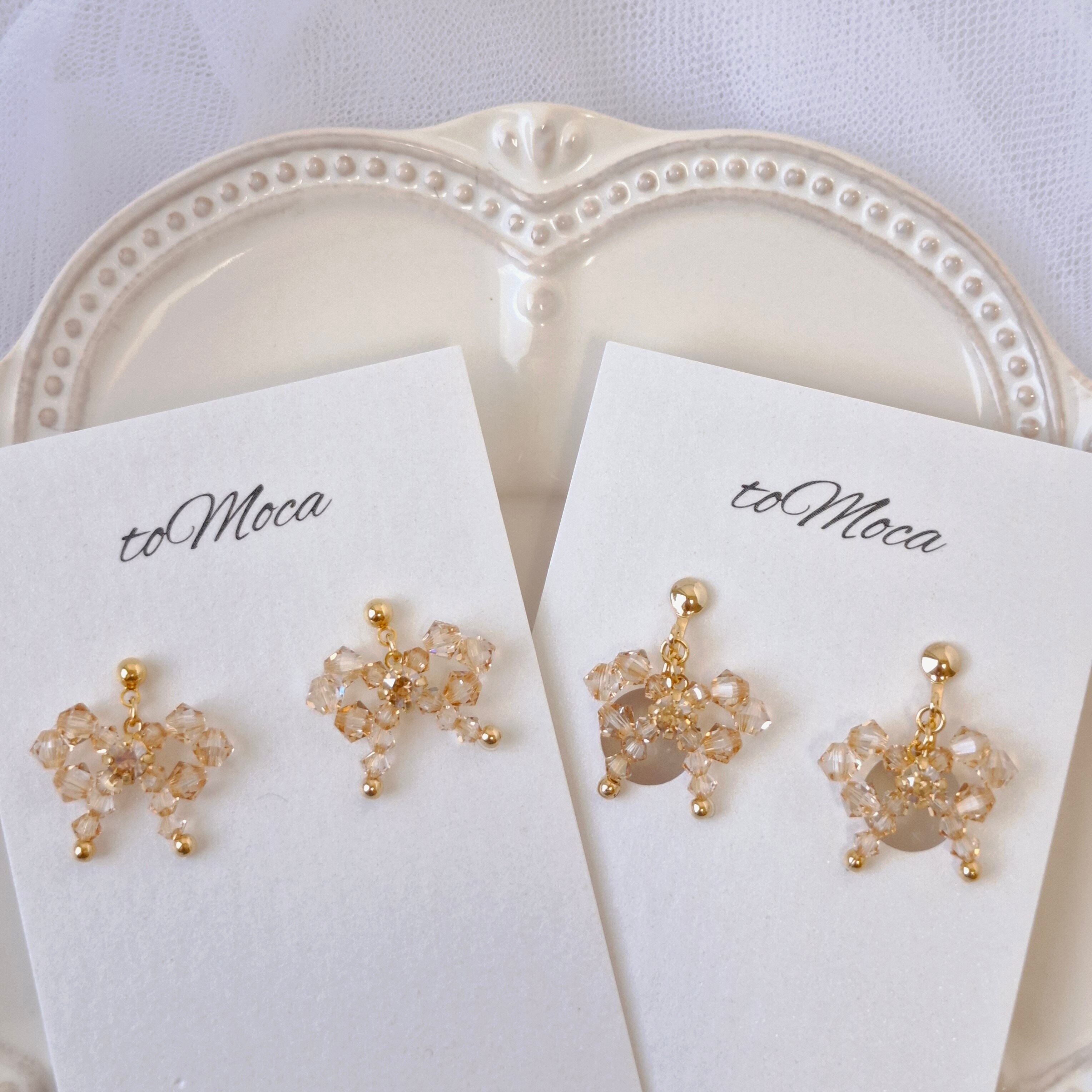 【Petit Beads Ribbon】 ビーズの揺れるリボンピアスorイヤリング【ゴールデンシャドウ】