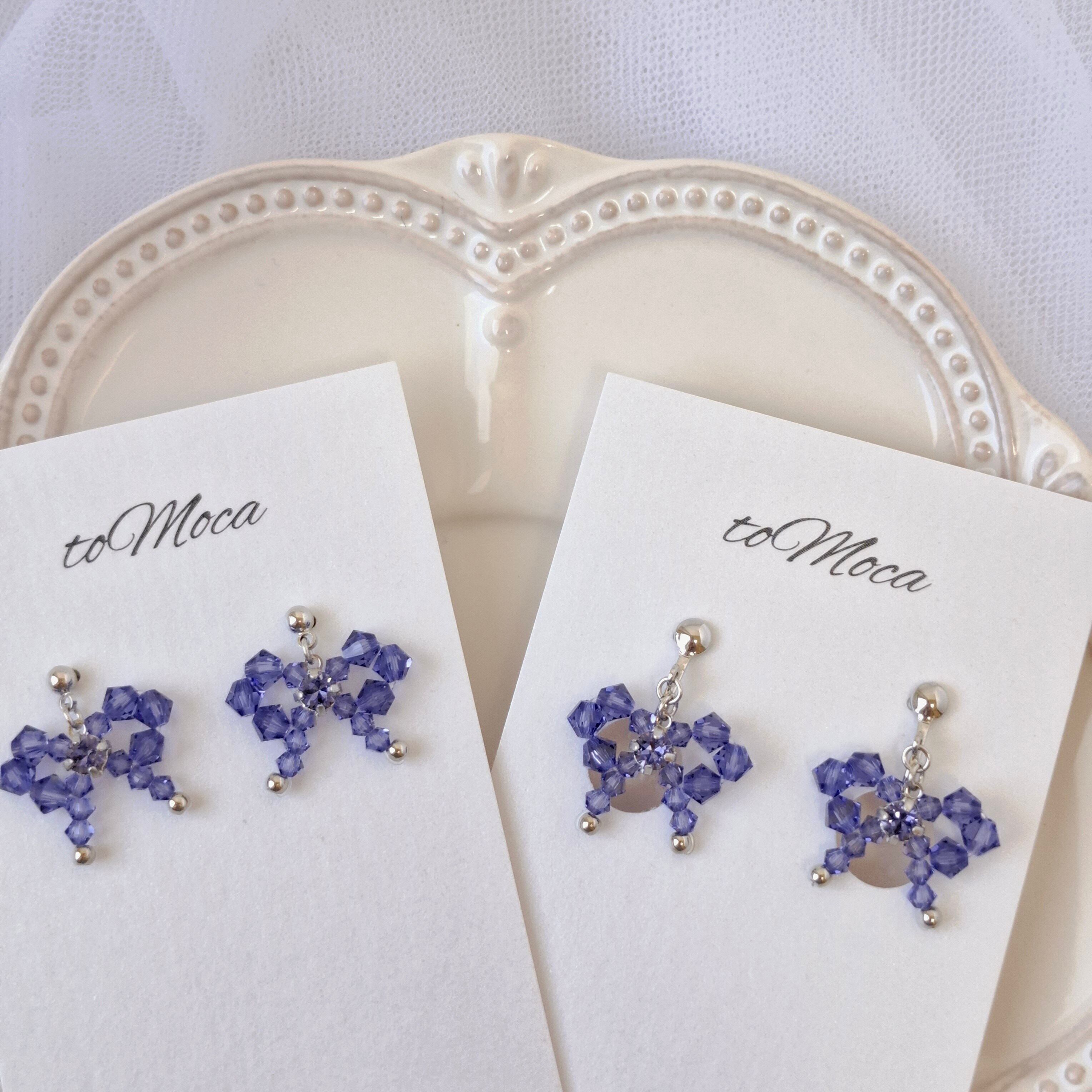 【Petit Beads Ribbon】 ビーズの揺れるリボンピアスorイヤリング【タンザナイト】